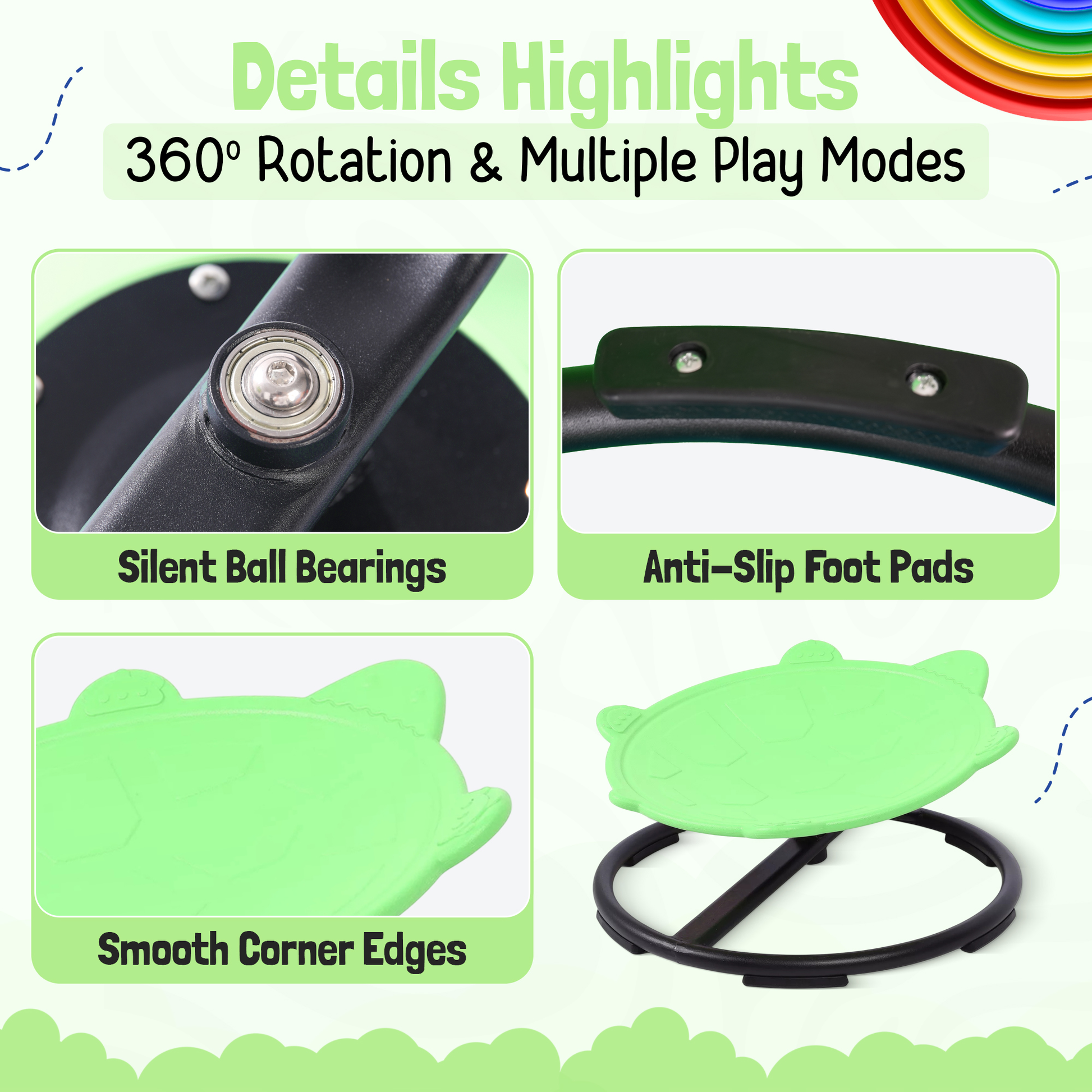 - Kids set their own pace—slow spins for relaxation or fast spins to build balance and coordination!