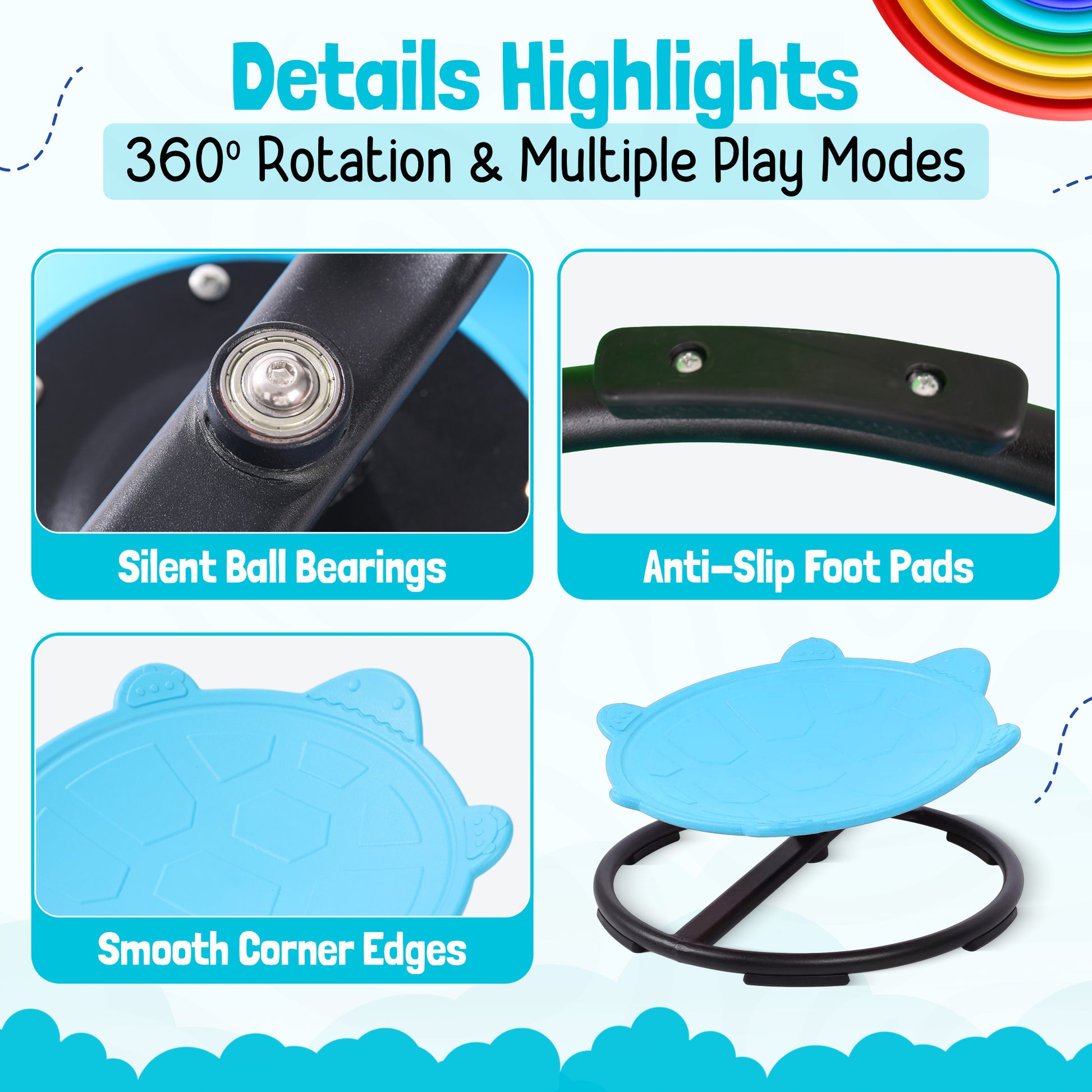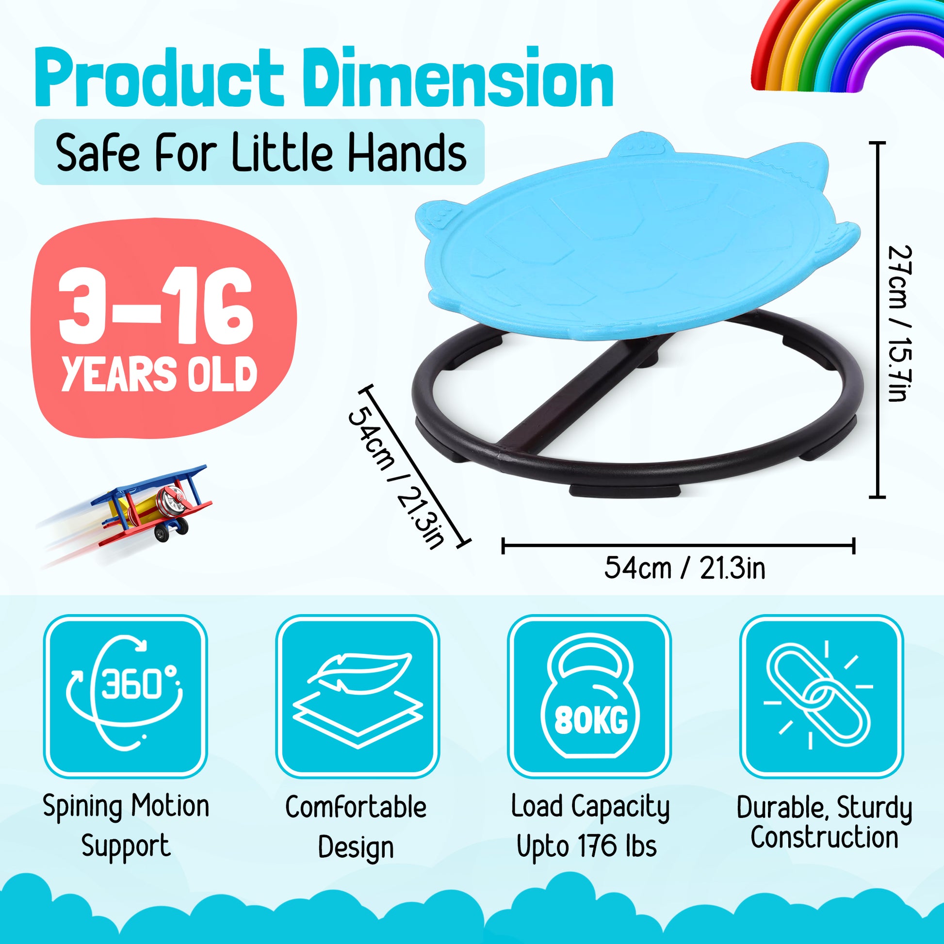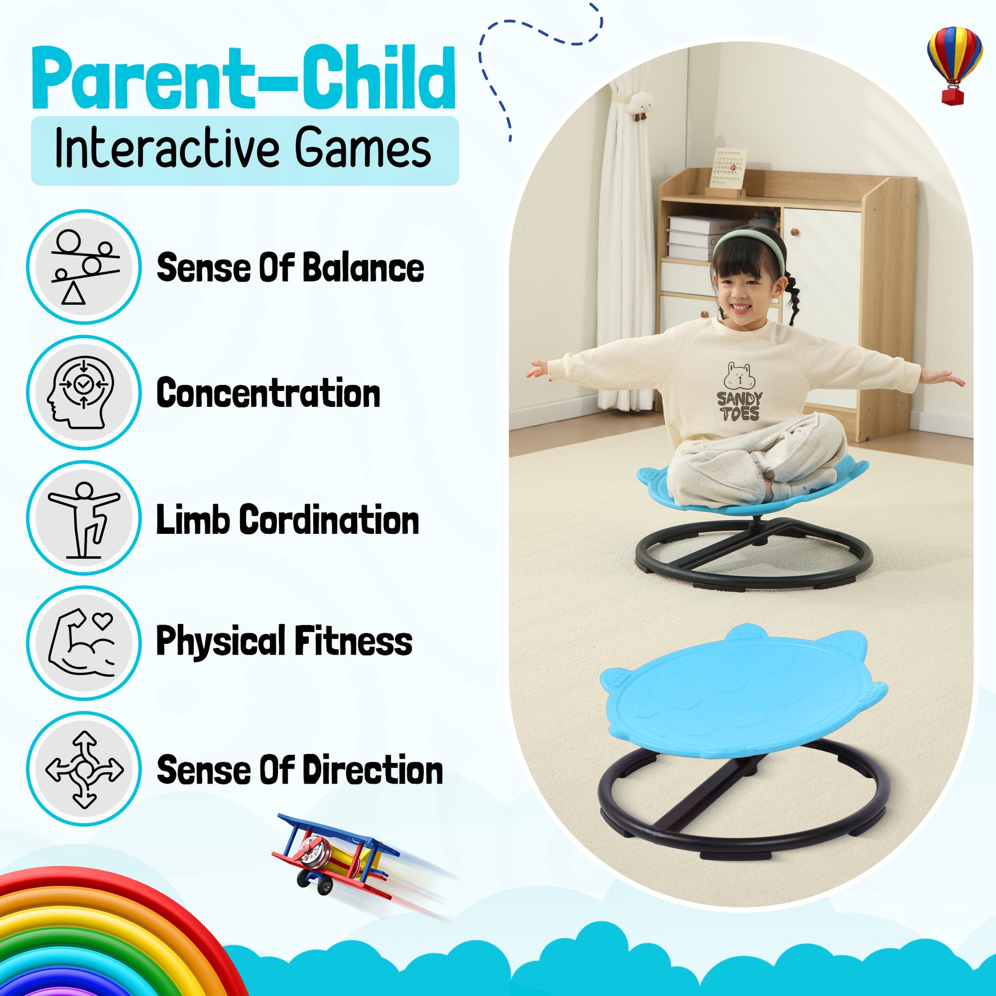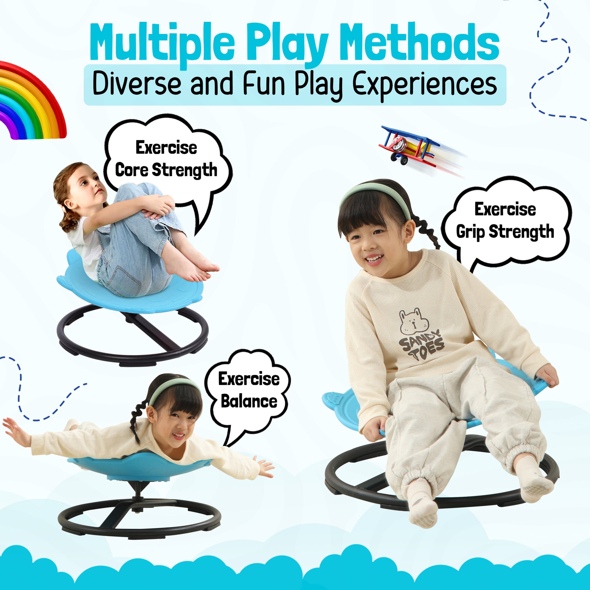 - Kids set their own pace—slow spins for relaxation or fast spins to build balance and coordination!