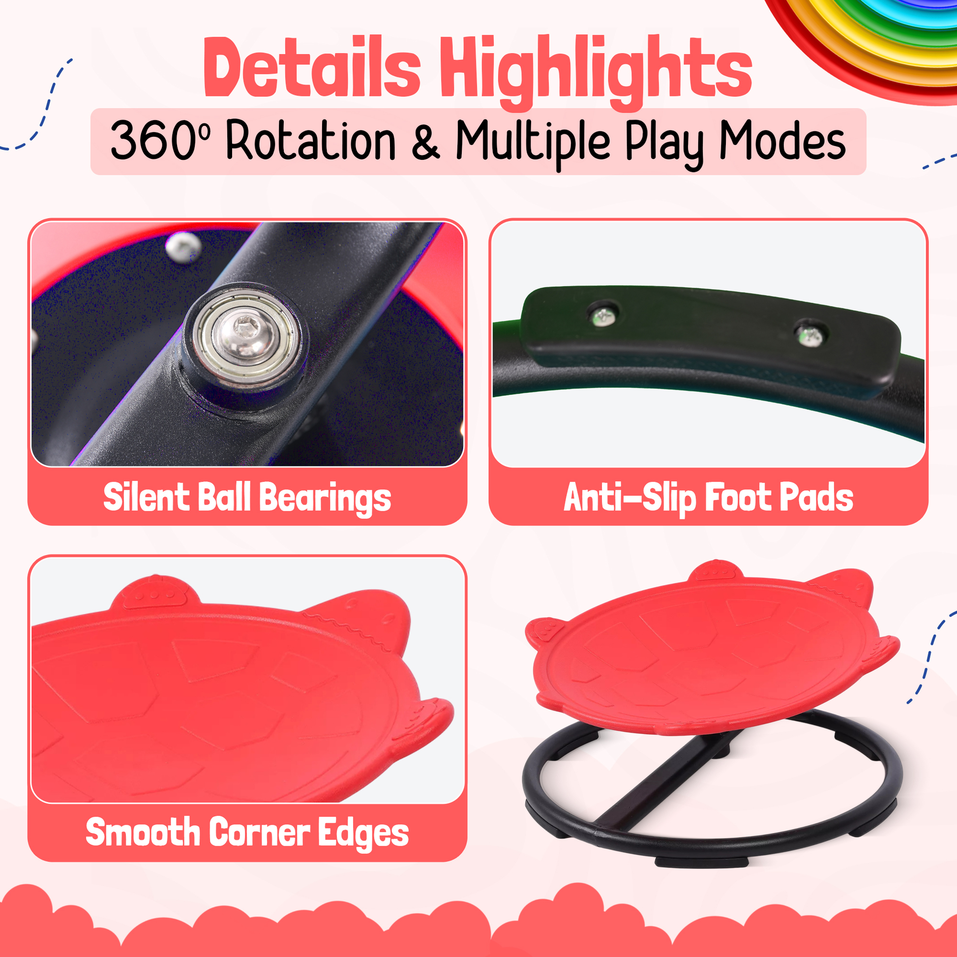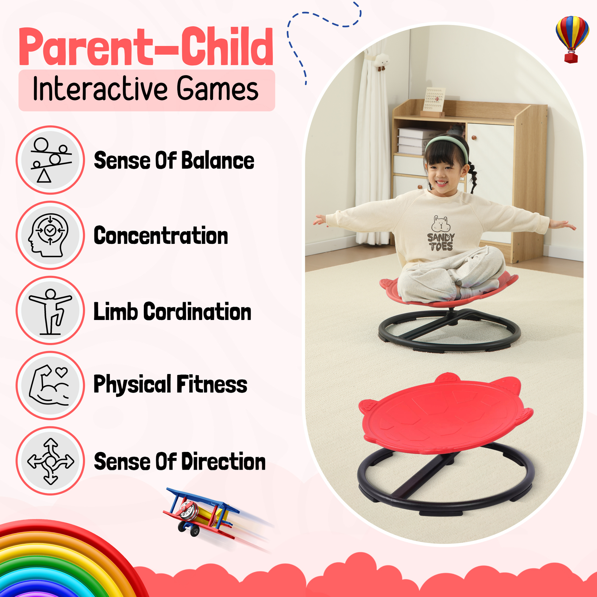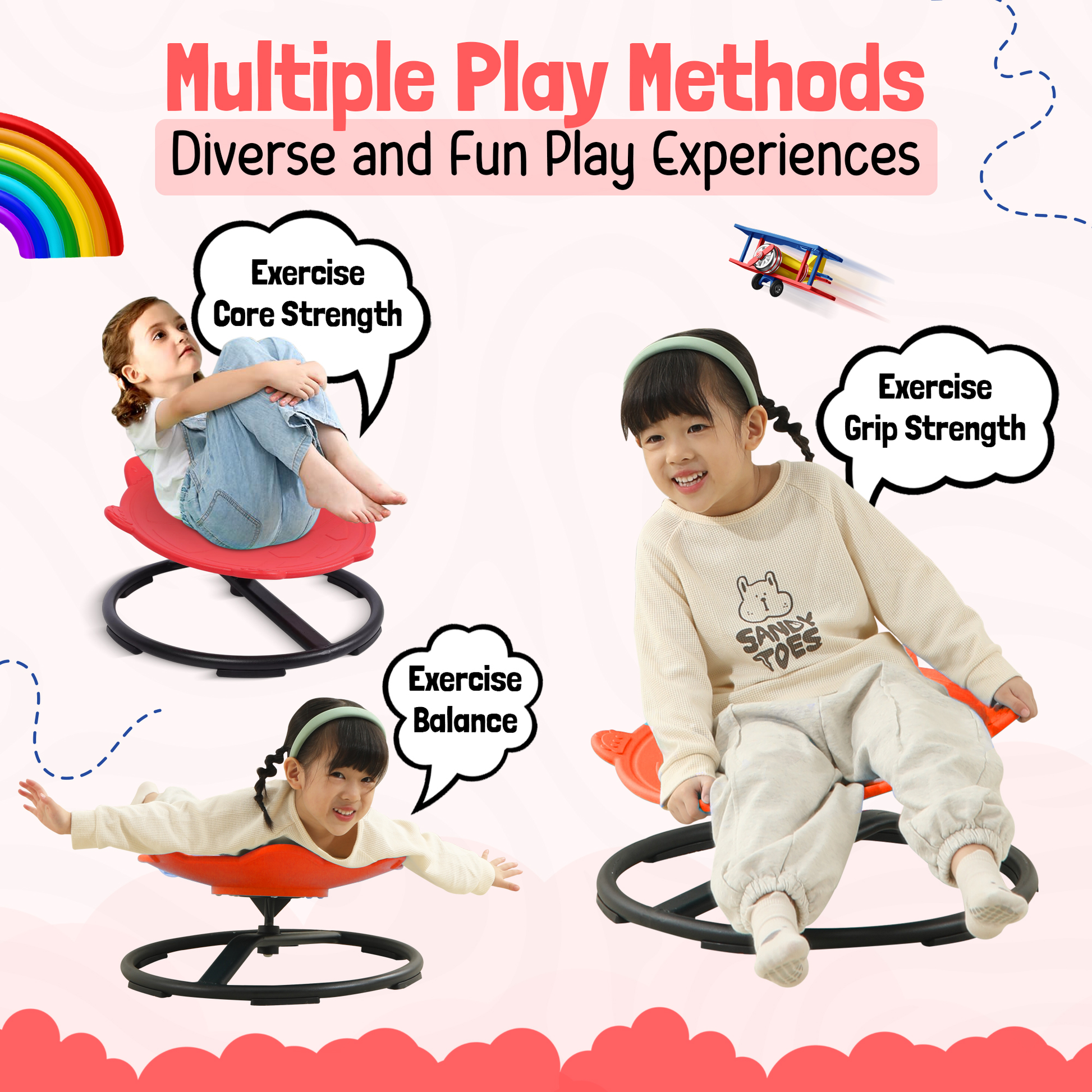 - Kids set their own pace—slow spins for relaxation or fast spins to build balance and coordination!