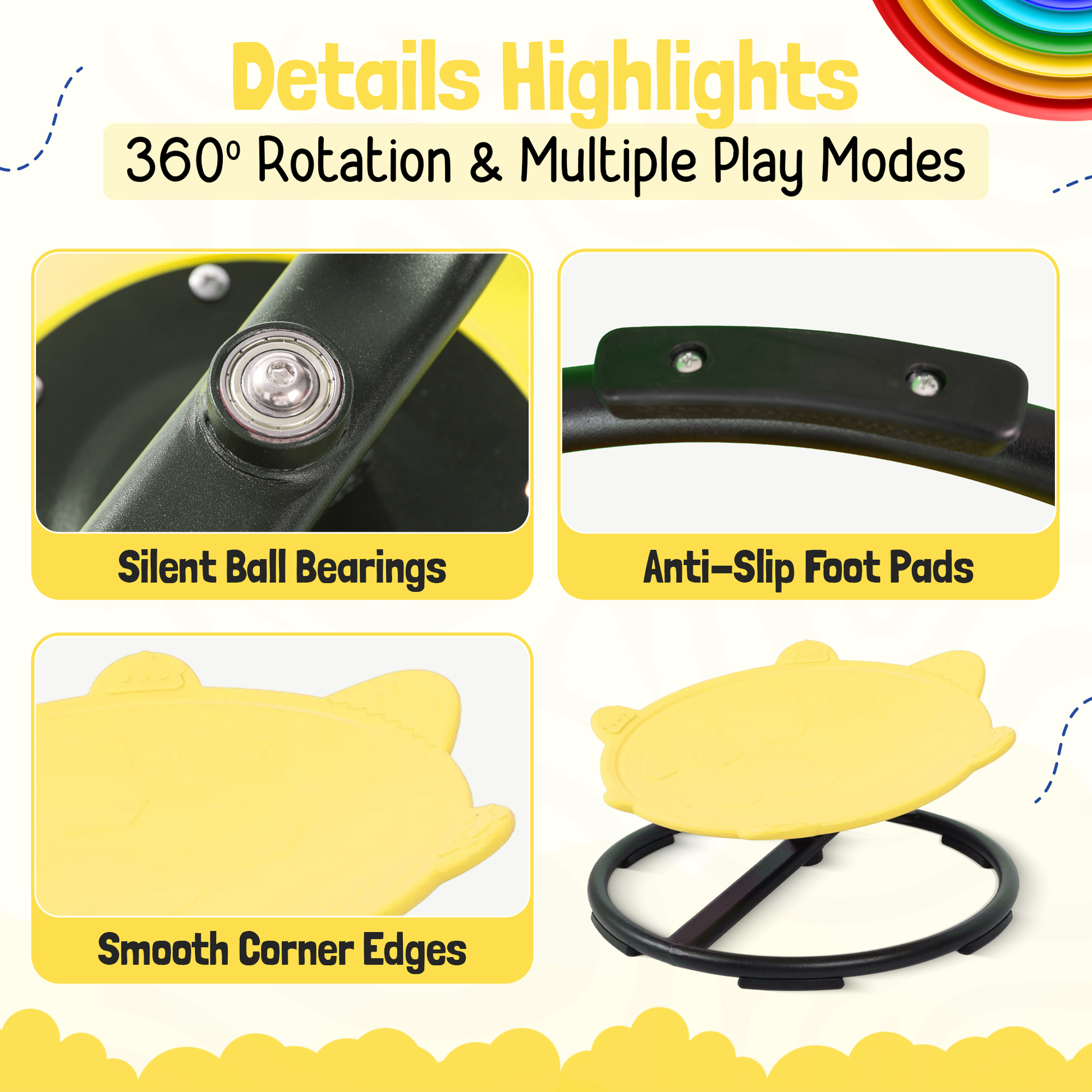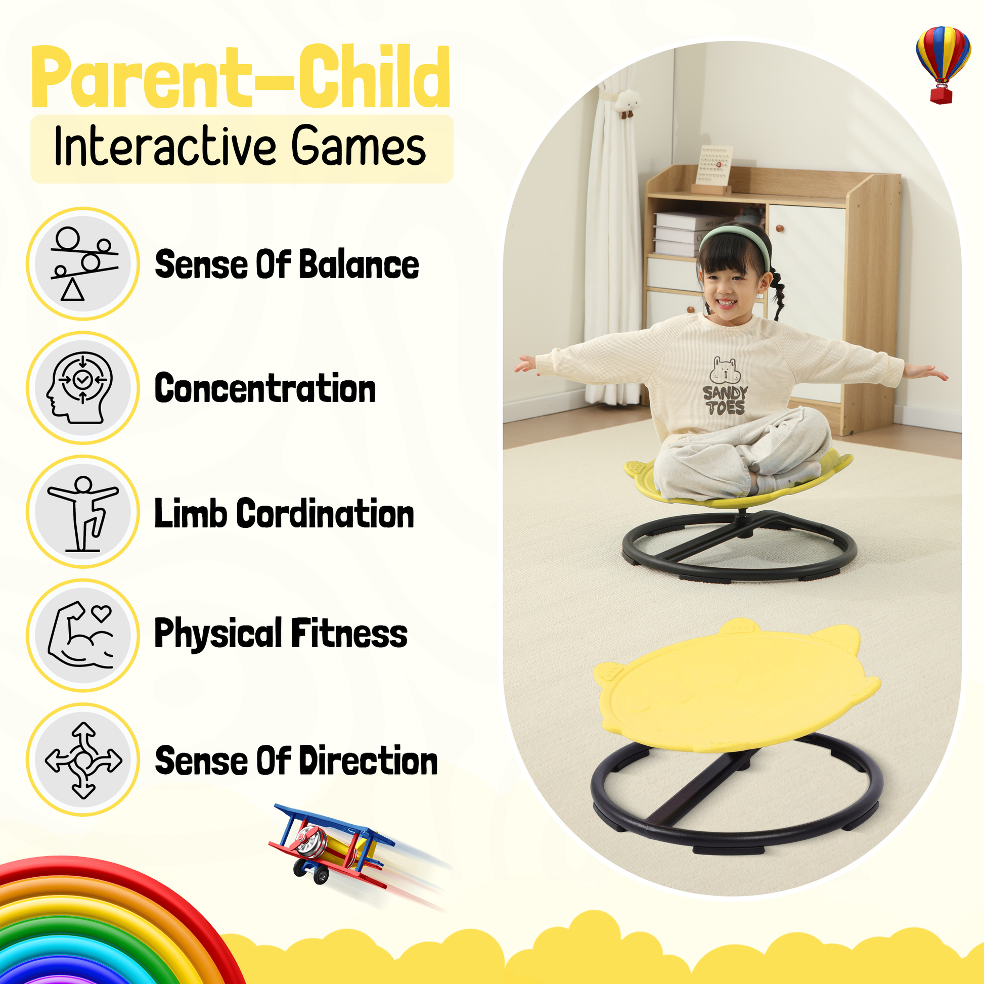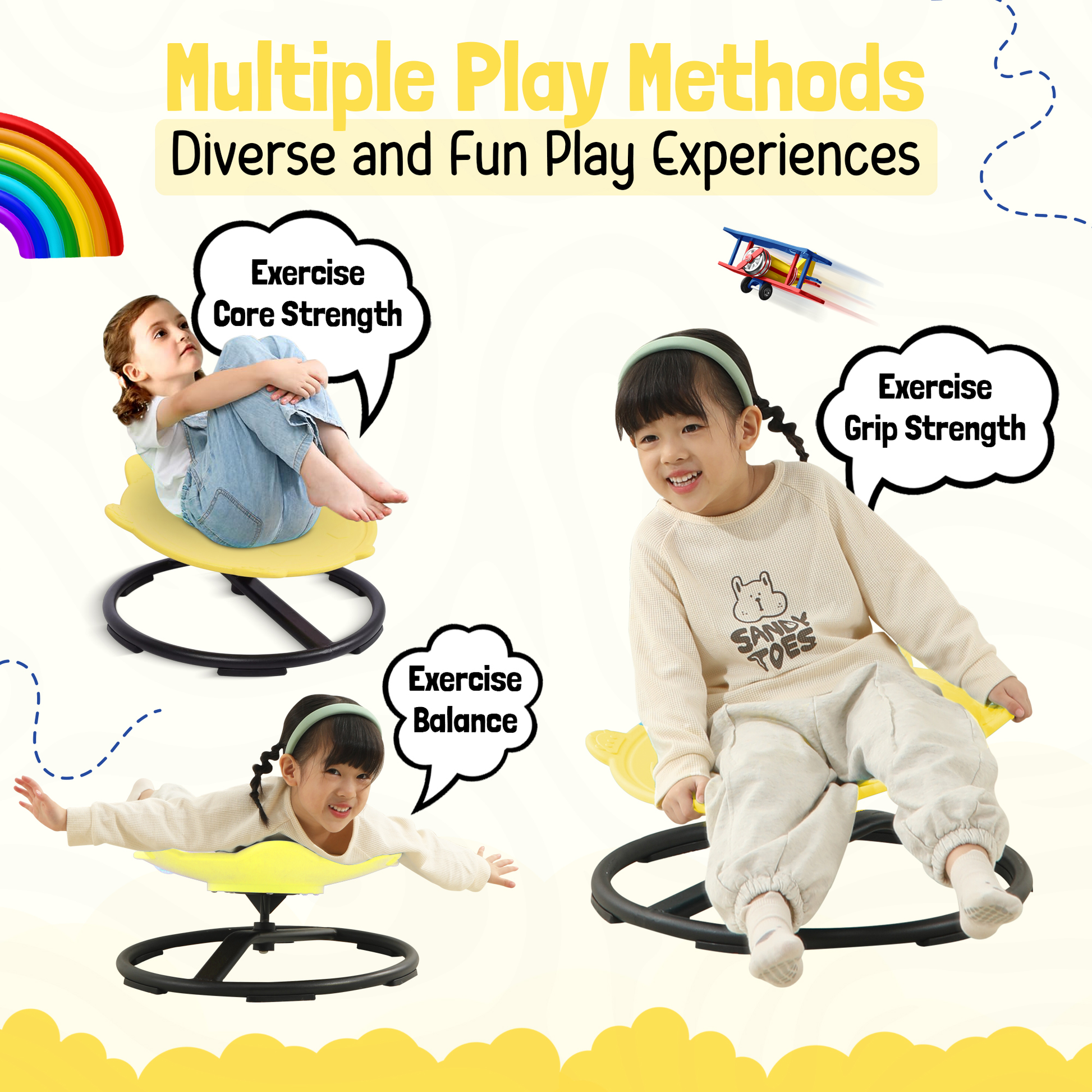 - Kids set their own pace—slow spins for relaxation or fast spins to build balance and coordination!